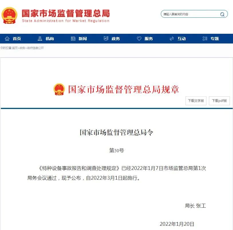 特種設(shè)備事故報(bào)告和調(diào)查處理規(guī)定 (2022年1月20日國(guó)家市場(chǎng)監(jiān)督管理總局令第50號(hào)公布,自2022年3月1日起施行)