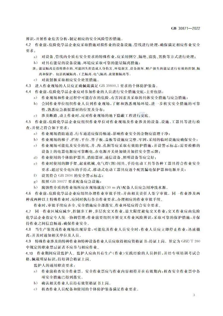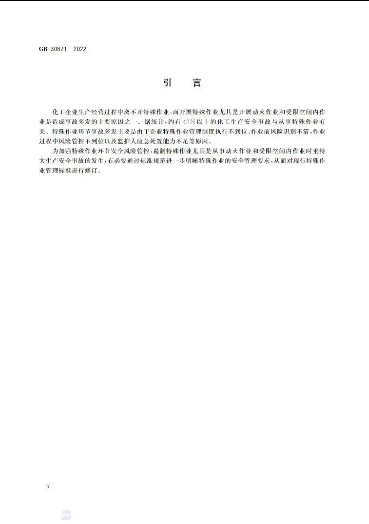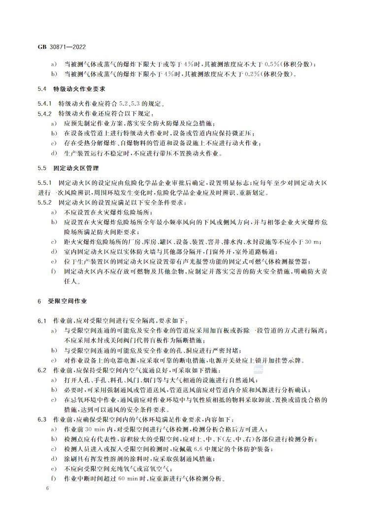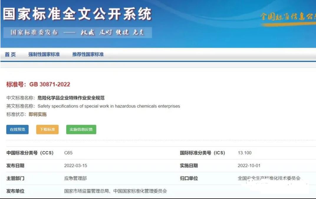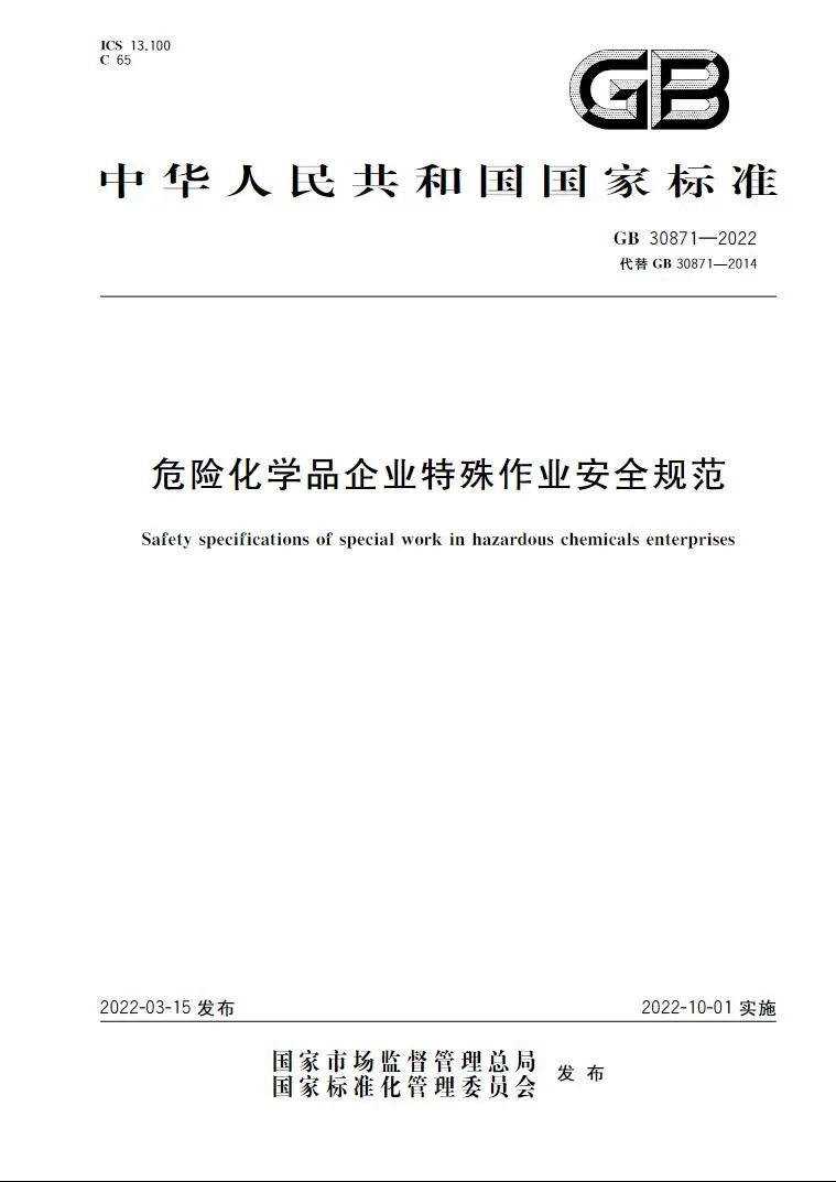 2022年3月,應急管理部組織修訂的國家標準《危險化學品企業(yè)特殊作業(yè)安全規(guī)范》(GB 30871-2022)已正式發(fā)布,將于2022年10月1日實施。