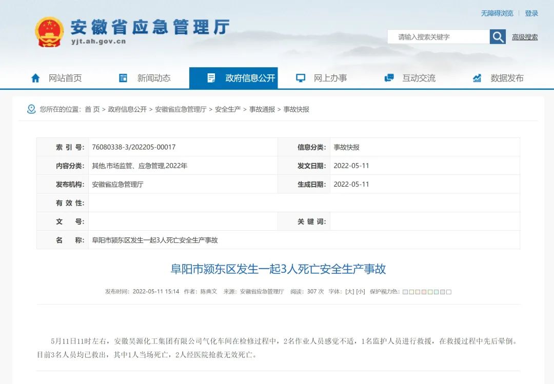 據(jù)安徽省應(yīng)急管理廳網(wǎng)站消息:5月11日11時左右,安徽昊源化工集團(tuán)有限公司氣化車間在檢修過程中,2名作業(yè)人員感覺不適,1名監(jiān)護(hù)人員進(jìn)行救援,在救援過程中先后暈倒。目前3名人員均已救出,其中1人當(dāng)場死亡,2人經(jīng)醫(yī)院搶救無效死亡。