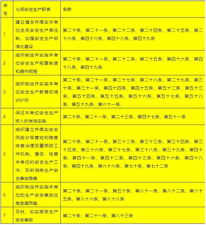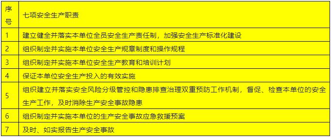 企業(yè)主要負責(zé)人法定七項安全生產(chǎn)職責(zé)內(nèi)容見下表: