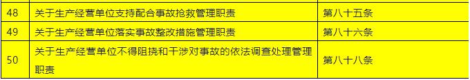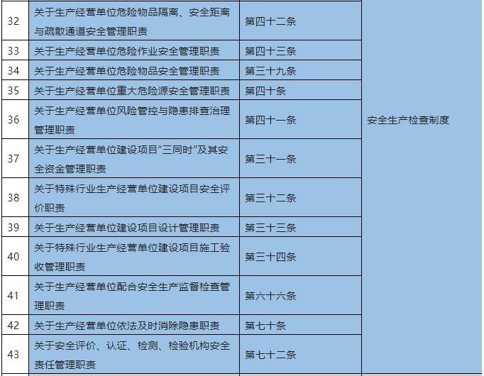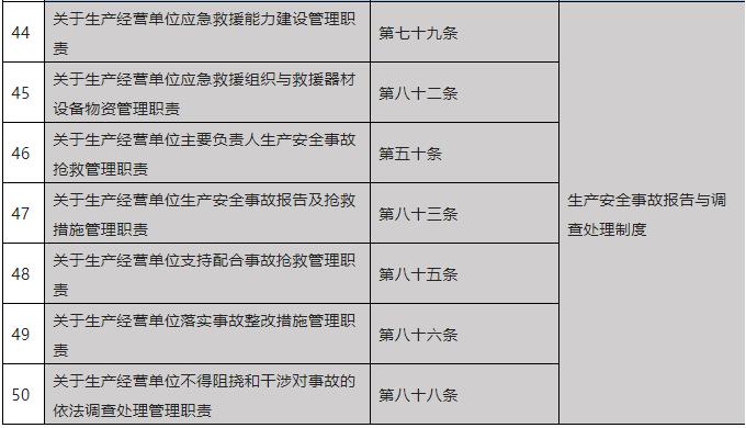 生產(chǎn)經(jīng)營單位主要負責(zé)人七項安全生產(chǎn)職責(zé)與生產(chǎn)經(jīng)營單位安全生產(chǎn)“50條職責(zé)”存在對應(yīng)的關(guān)系,如下表所示: 七項安全生產(chǎn)職責(zé)與50條職責(zé)對照關(guān)系分析表