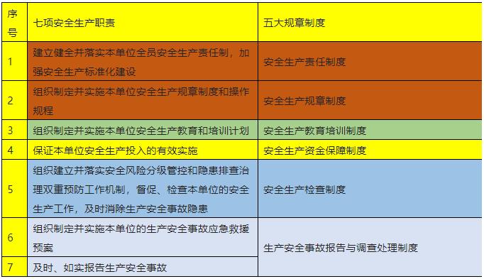 以生產(chǎn)經(jīng)營單位主要負責(zé)人七項安全生產(chǎn)職責(zé)來講,亦可歸納為五大制度,均可歸結(jié)為安全生產(chǎn)規(guī)章制度,如下表所示: 七項安全生產(chǎn)職責(zé)與安全生產(chǎn)“五大規(guī)章制度”關(guān)系對照表