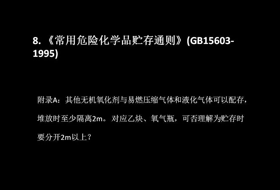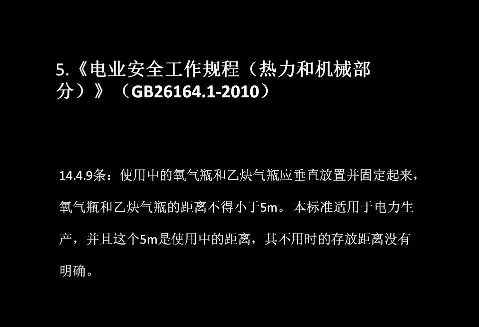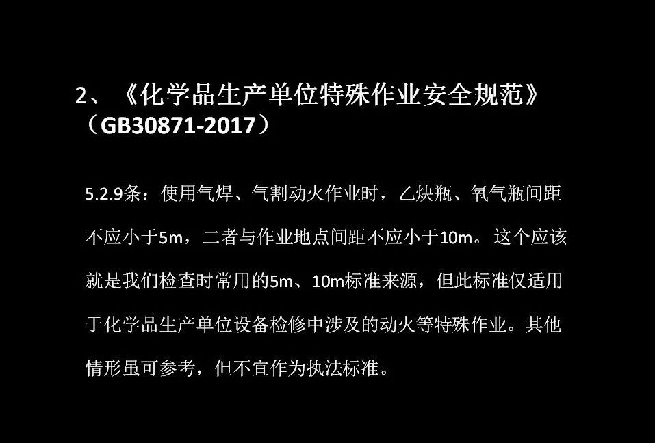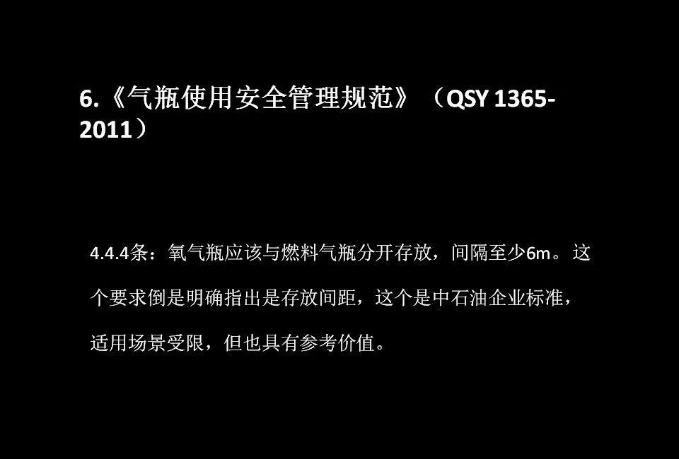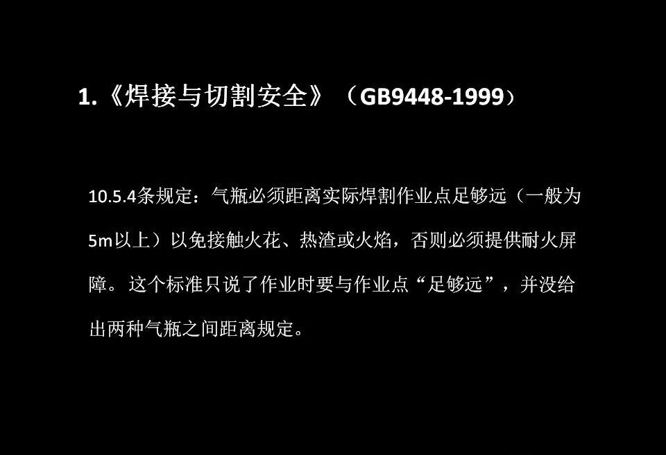 乙炔、氧氣瓶存放距離到底應(yīng)為多少才安全?關(guān)于這個(gè)問題的答案網(wǎng)上和公眾號(hào)里眾說(shuō)紛紜,作為一個(gè)追求用標(biāo)準(zhǔn)說(shuō)話的安全人,今天對(duì)這個(gè)問題重新進(jìn)行了研究,查到現(xiàn)行以下標(biāo)準(zhǔn):