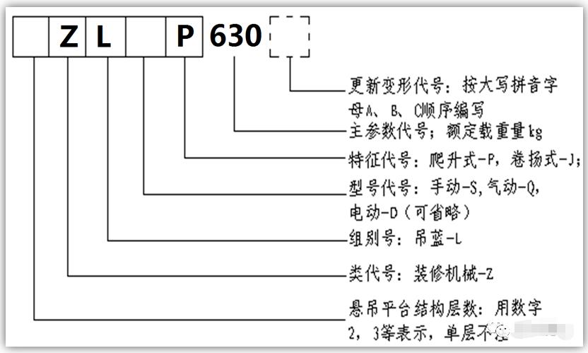 4、高處作業(yè)吊籃型號(hào) 高處作業(yè)吊籃型號(hào)是由類、組、型代號(hào)、特征代號(hào)和主要代號(hào)及更新型代號(hào)組成。