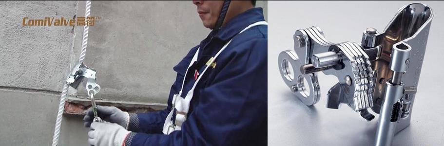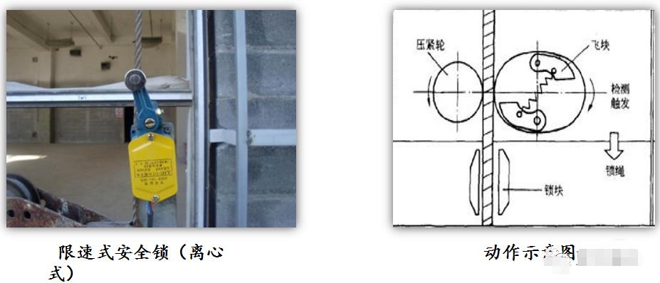 8、高處作業(yè)吊籃安全鎖 安全鎖按其工作原理,可分為離心觸發(fā)式和擺臂防傾式兩類。 離心觸發(fā)式:當(dāng)?shù)趸@的下降速度超過一定數(shù)值,飛塊產(chǎn)生的離心力克服彈簧的約束力向外甩到一定程度時(shí),觸動(dòng)等待中的執(zhí)行元件,帶動(dòng)鎖繩機(jī)構(gòu)動(dòng)作,將鎖塊鎖緊在安全鋼絲繩上。