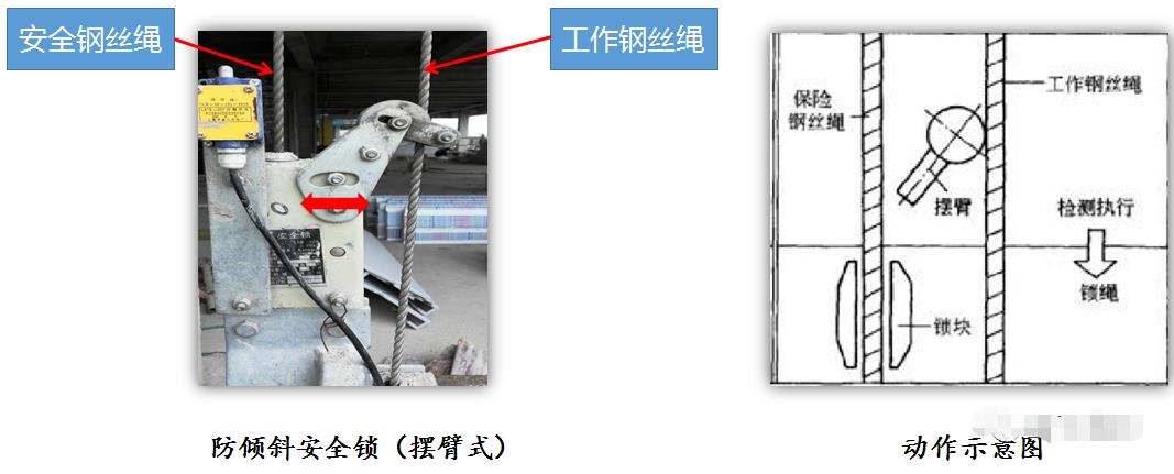擺臂防傾式:具有鎖繩角度探測機(jī)構(gòu),當(dāng)?shù)趸@發(fā)生傾斜或工作繩斷裂、松弛時(shí),其鎖繩角度探測機(jī)構(gòu)即發(fā)生角度位置變化,帶動(dòng)執(zhí)行元件使鎖繩機(jī)構(gòu)動(dòng)作,將吊籃鎖住。