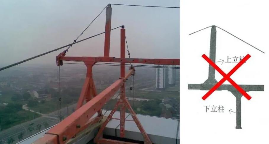 ▲吊籃前支架與上立柱未處于同一垂直線,錯(cuò)誤