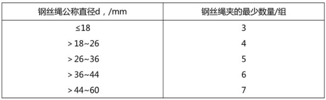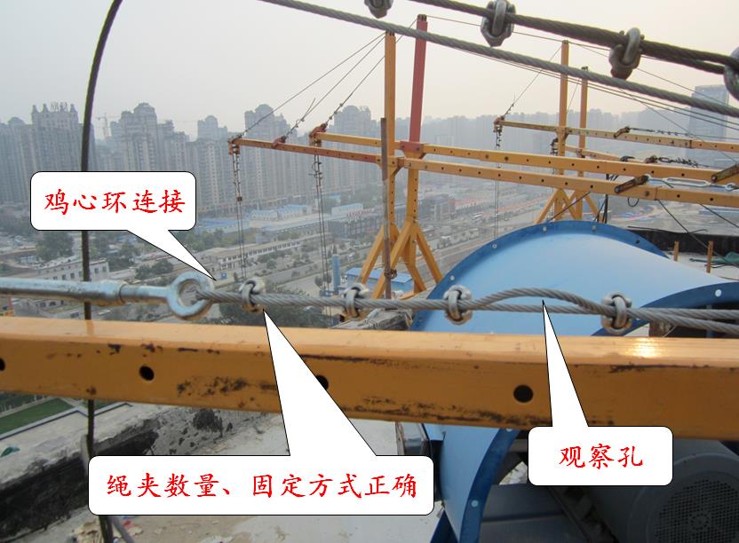 吊籃鋼絲繩端固定繩夾數(shù)量最少3只(在鋼絲繩公稱直徑dr≤18mm時(shí),具體數(shù)量可查閱規(guī)范),U形螺栓扣在鋼絲繩的尾段上,繩夾不得交替布置。鋼絲繩在做回彎時(shí),必須使用雞心環(huán)保護(hù)使其圓滑過渡。