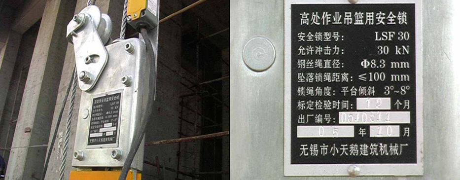 吊籃應(yīng)安裝防墜安全鎖,銘牌清晰,鎖具靈敏有效,安全鎖不應(yīng)超過標(biāo)定期限。吊籃應(yīng)安裝上限位裝置,并應(yīng)保證限位裝置靈敏可靠。